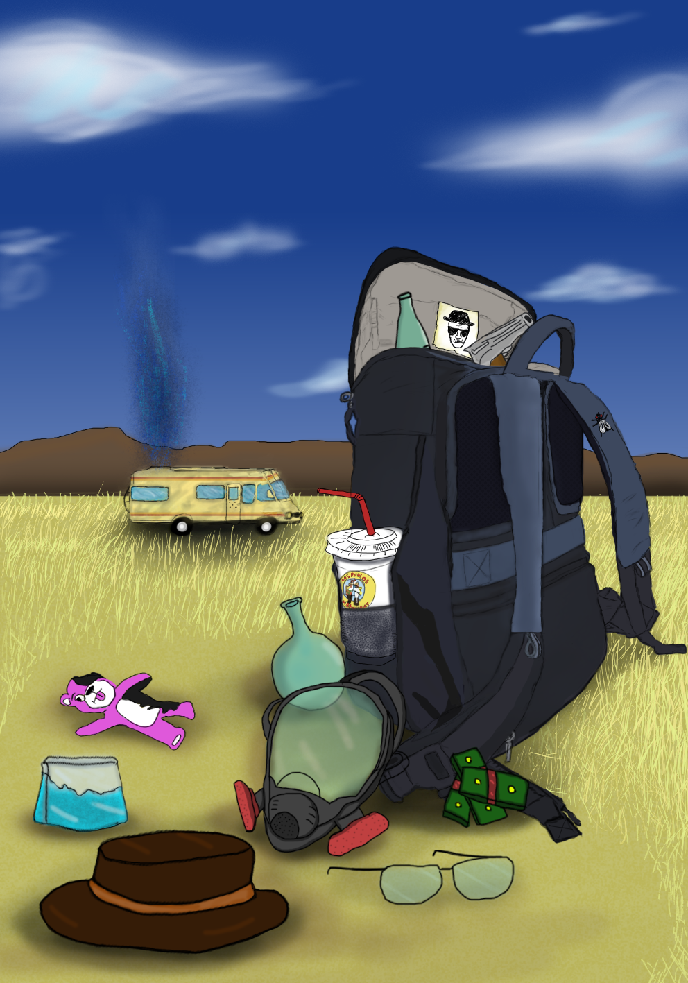 .להלן איור דיגיטלי שהכנתי בפוטושופ ,באיור רואים את חפצים של דמות בתיק שלי .בחרתי בדמות של וולטר וויט מתוך מחווה לסדרה